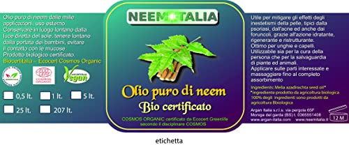 Olio puro di Neem Creato per la pelle, Biologico e certificato da istituto internazionale COSMOS ORGANIC ECOCERT / BIOCERTITALIA. Istruzioni all'uso in etichetta, come immagine di lato.