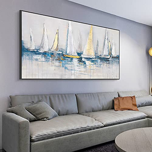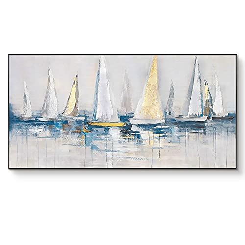 Olio su Tela,Bianco E Giallo Barca A Vela sulla Superficie del Mare Grande Pittura A Olio Arte Moderna Astratta Opera d'Arte su Tela Wall Art Dipinti Soggiorno Camera da Letto Decorazioni per La CAS