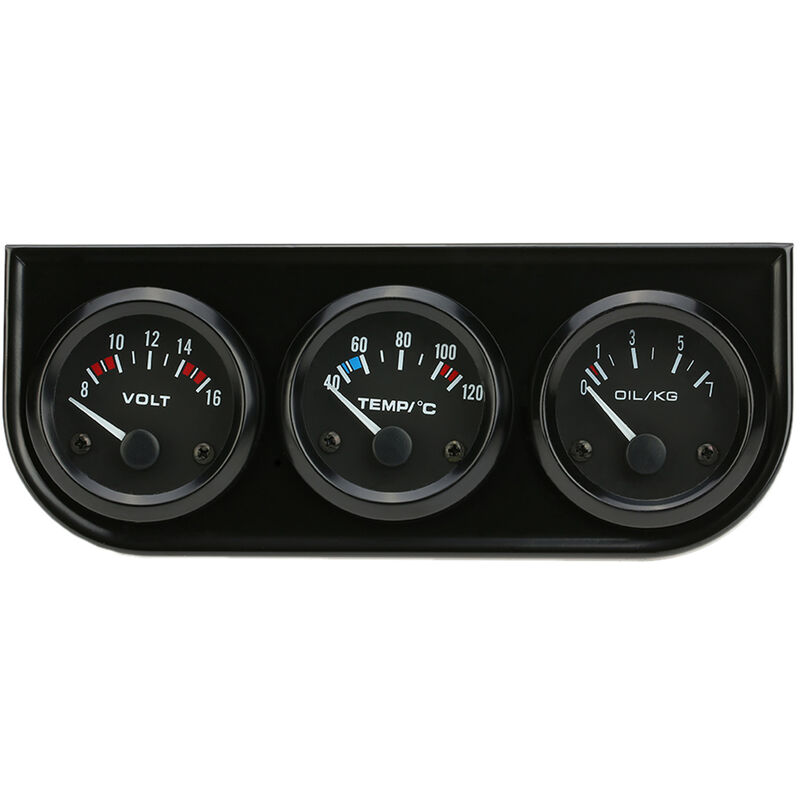 3 in 1 corredo Gauge Triple: Pressione olio + Temperatura + voltmetro Caratteristiche: Pressione olio e temperatura acqua e voltmetro 3 in 1 kit di gauge. Il calibro è di alta sensibilità e precisione senza pari. Con calibro retro-illuminato a LED. staffa in metallo nero e il pannello lunetta nera. specifiche tecniche: Colore nero Materiale: metallo Alimentazione: 12V Montaggio: per 12v auto e moto manometro dell'olio: da 0 a 7 bar calibro tensione: 8 a 16 V Acqua del calibro del Temp: 40 a 120 ℃ Diametro Elemento: 5cm / 2in Dimensione del prodotto: 19 * 7.5 * 5.5 formato del pacchetto: 24 * 9 * 9cm / 9.4 * 3.6 * 3.6in Peso del pacchetto: Circa. 468g Lista del pacchetto: 1 * Gauge 1 * Sensore di pressione dell'olio 1 * sensore temperatura acqua 1 * Manuale dell'utente 1 * Sacchetto di Nut
