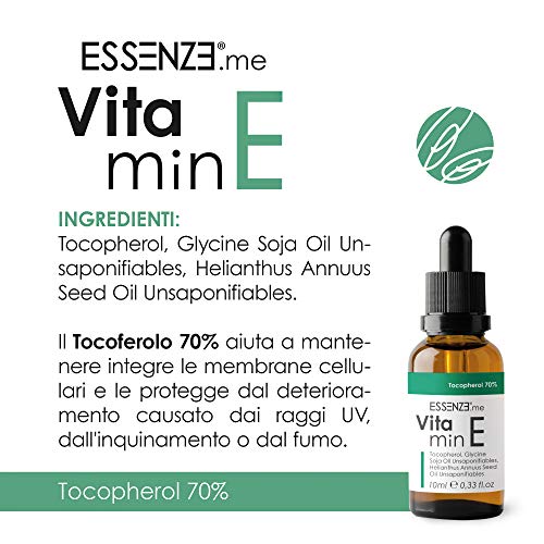 QUALITÀ DEL PRODOTTO e MADE IN ITALY La vitamina E di Essenze.me è un prodotto professionale ad uso cosmetico di alta qualità che combina il 70% di tocoferolo puro con insaponificabili di Soia e di Girasole. Gli insaponificabili di oli vegetali aumentano l'azione attiva della vitamina E e preparano i tessuti a essere più recettivi.