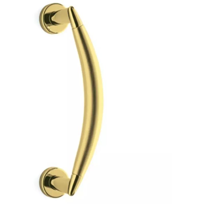 Maniglione Zancato OLIVARI Aster in Ottone, finitura Super Oro Lucido - Satinato . La confezione comprende un singolo maniglione . Da ordinare a parte i fissaggi con codice: - OLFR01 ( Kit per Fissaggio Maniglione singolo con rosetta - OLFR03 ( Kit per Fissaggio coppia di maniglioni dentro fuori Dimensioni: Interasse fori 250 mm Lunghezza totale 280 mm Diametro bocchette 47 mm Ingombro 65 mm Colore: Super Oro Lucido - Satinato
