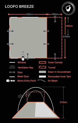 Tecnologia del fascio gonfiabile: il Loopo Breeze utilizza la tecnologia del fascio gonfiabile in TPU rinforzato per creare una tenda gonfiabile che si gonfia e si avvicina in 15 minuti per un montaggio rapido ed efficace. Le travi impiegano pochi secondi per gonfiarsi al margine consigliato di 7 psi (pompa inclusa).