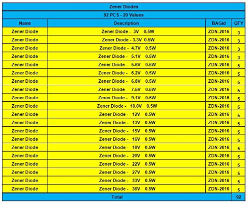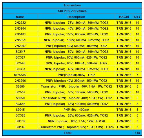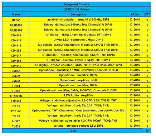 Il kit include PNP e NPN transistor - circuiti di potenza e bassa potenza, analogico e digitale integrato, Amplificatori di potenza, tensione stabilizzatori, Amplificatori operazionali, Darlington Array, infradito, banconi, varie combinazioni di Digital Logic Gates e accoppiatori ottici, grande selezione di condensatori elettrolitici con gamma da 5 a 20 pezzi di ogni valore, che copre quasi ogni standard Capacitanza valori da 0.47uf a 330uf.