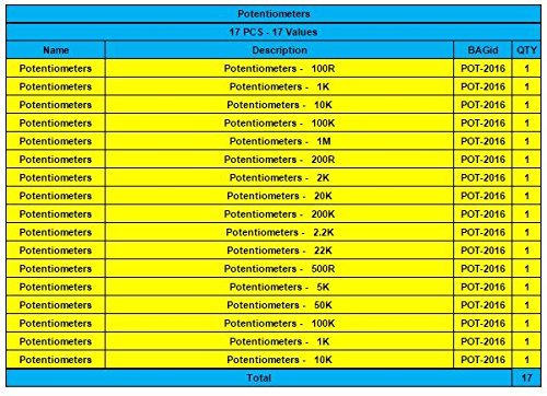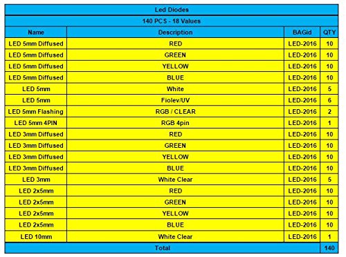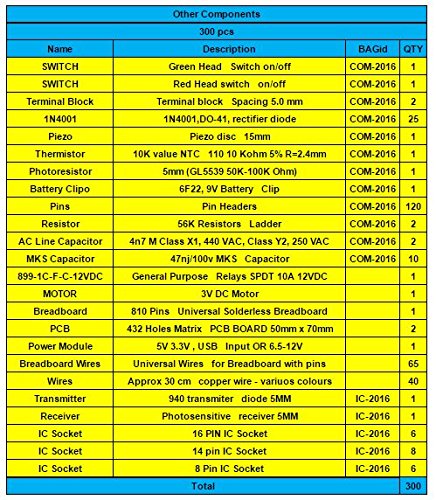 Grande numero di vari emitiing diodi LED con vari colori e tipi, tra cui blu, viola, rosso, giallo, lampeggiante LED, molti potenziometri, interruttori Tact, micro-interruttori, termistori photo-resistors, 0.5 W Zener Diodi emettitori (da 3 V a 36 V), e ricevitori IR, motore DC, relè, prese per ciascun circuito integrato, alcuni induttore bobine, gamma completa di condensatori in ceramica e ampia gamma di resistenze che coprono l' intera gamma di valori popolari.