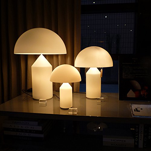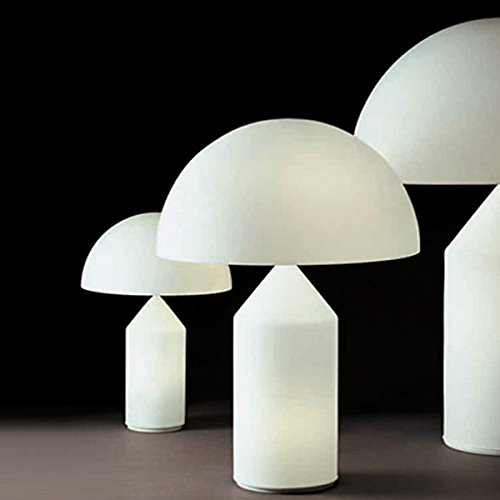 Lampada da tavolo ATOLLO a luce diretta in vetro di Murano opalino, nella versione intermedia della serie, completa di due portalampada a vite per un massimo di 75W l'uno. Interruttore completa di dimmer per regolare l'intensità della luce.