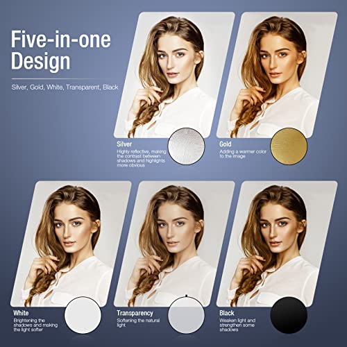 [Riflettore multifunzionale 5 in 1] Ci sono cinque diverse superfici riflettenti in bianco, trasparente, nero, argento e oro, che possono riempire, riflettere, diffondere, assorbire o ammorbidire la luce, sottolineando i dettagli del processo di ripresa. Il telaio in acciaio resistente e flessibile può essere facilmente piegato in piccole dimensioni. La dimensione aperta del riflettore è di 60 cm e la dimensione piegata è di 20 cm. Che è molto comodo da trasportare.