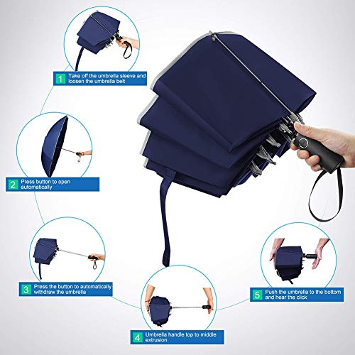 Materiale Impermeabile: Utilizziamo il tessuto di livellamento 190T con rivestimento - eccellente resistenza all'acqua, asciugatura rapida e prevenire la muffa. Chiudi l'ombrello, scuotilo dolcemente, l'acqua rotolerà, non bagnerà la tua auto, nei luoghi pubblici non darà altri problemi.Non è come l'ombrello da viaggio generale. Con un robusto design in metallo e 10 nervature in acciaio inossidabile, può rimanere stabile in caso di vento forte.
