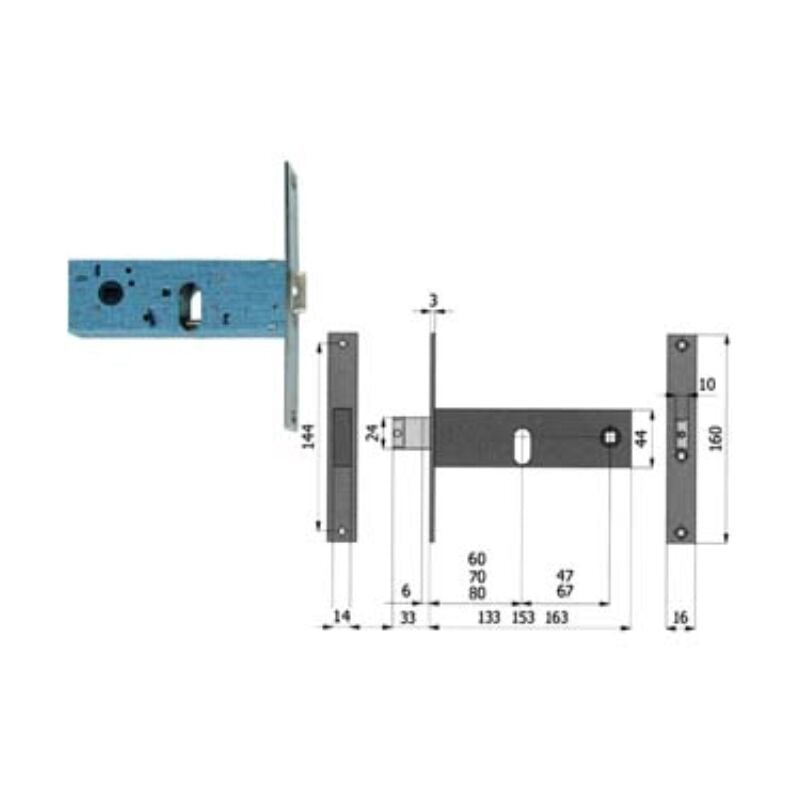 Mm.80 interasse mm.67 (890) scatola e coperchio in acciaio zincato e plastificato per montante a fascia, frontale da mm.16x3x160h. in acciaio nichelato e cromato, catenaccio e scrocco incorporato reversibile in lega speciale nichelata da mm.10x24h. a 2 mandate con richiamo tramite chiave o quadro maniglia da mm.8 passante, funzionante con cilindro ovale non compreso, scatola mm.44h. Categoria merceologica: Serrature, chiusure di sicurezza e accessori - Sicurezza - Serrature per fasce da infilare