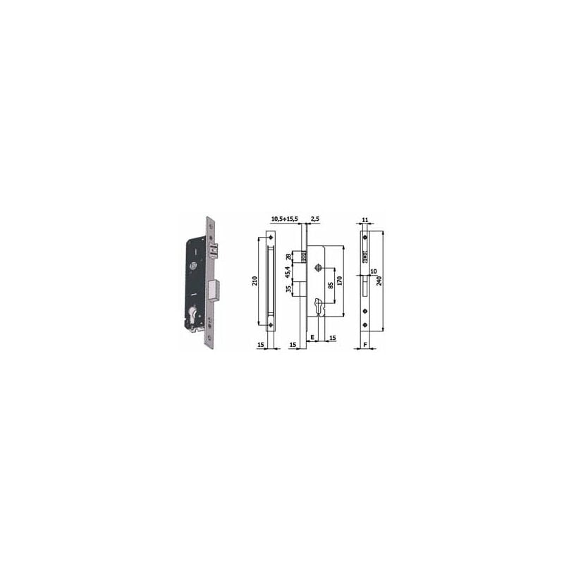 Mm.35 interasse mm.85 (1300.35.22) scatola e coperchio in acciaio zincato e plastificato frontale in acciaio inox mm.22 catenaccio in lega speciale nichelata scrocco anti rumore in lega speciale nichelata catenaccio comandato dalla chiave scrocco comandato dalla chiave o dalla maniglia reversibile 1 mandata in dotazione: vite cilindro cilindro non compreso Pezzi per confezione primaria: 10,0 Larghezza 34 Lunghezza 18,4 Altezza 7,9 Peso 2,649