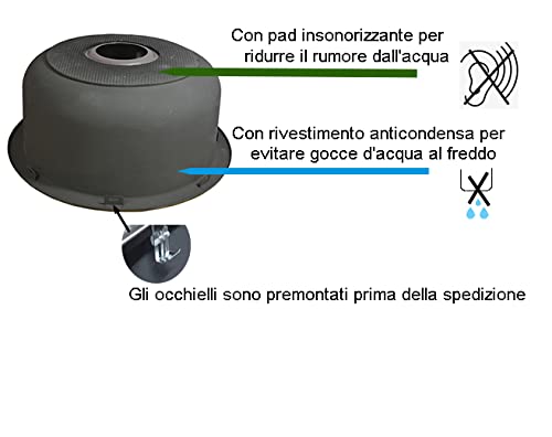 * Con rivestimento anti-condensa sul fondo /*Con cuscinetto fonoassorbente sul fondo per ridurre il rumore dall'acqua/*inoltre con 8 occhielli per un migliore fissaggio al fondo del bordo/con protezione contro il traboccamento dell'acqua/* Include filtro di scarico in acciaio inox e tappo di scarico