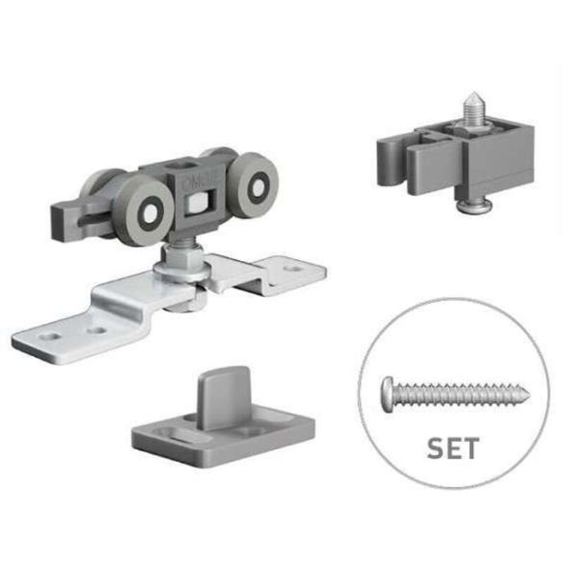 Pz 2 carrelli piastra acciaio ruote nylon Pz 2 fermaporte con aggancio Guida pavimento nylon Viti fissaggio incluse Adatti installazione porta aggiuntiva binari 1390