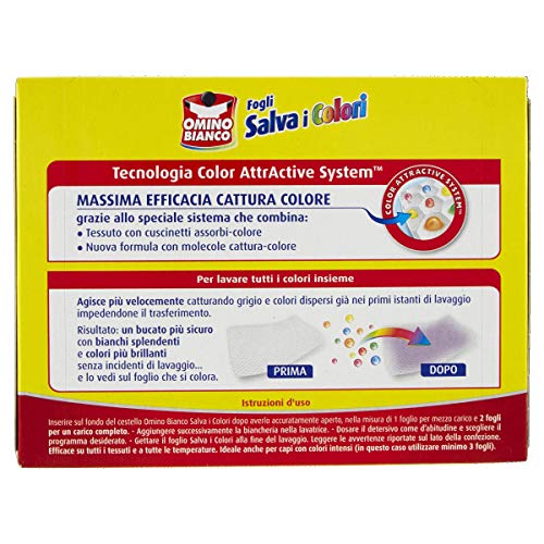 Prodotto: Omino Bianco fogli salva colore in tessuto con cuscinetti assorbi-colore e formula cattura-colore per un'azione mirata