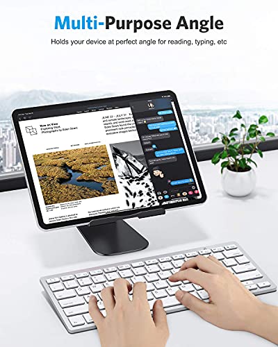 Visualizzazione muti-angolare. Questo supporto per tablet regolabile (210 gradi rotabile) può contenere il tablet orizzontalmente o verticalmente, fornendo un angolo di visualizzazione multiplo durante la visione di video, la visualizzazione di foto, la lettura o la digitazione.