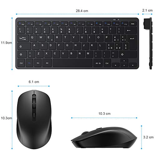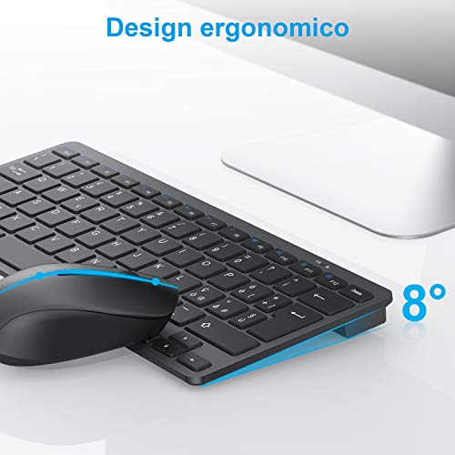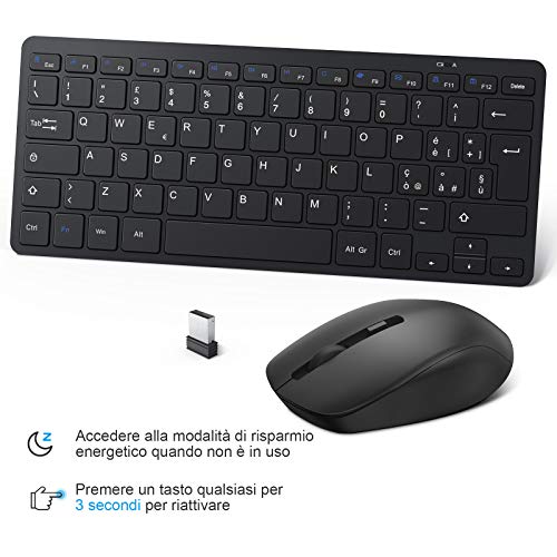 OMOTON Set Tastiera e Mouse Wireless Mini, Ultra-Sottile, Leggero, Compatto e Portatile per Windows 7,8,10,XP,VISTA, Italiano Layout QWERTY con 78 Tasti, Ricevitore USB 2.4Ghz Stabile, Nero