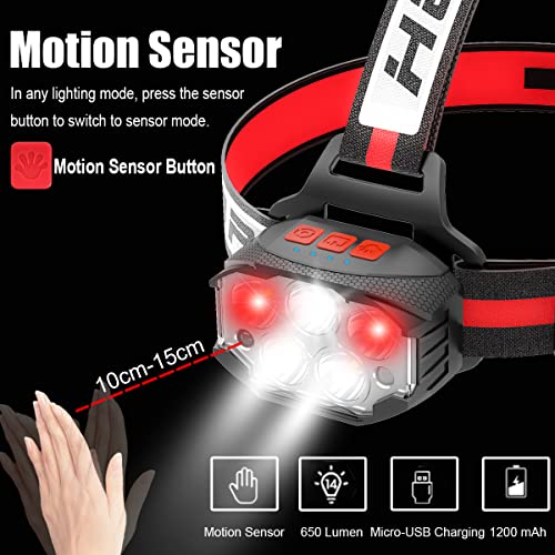 OMSEN Torcia Frontale, Lampada Frontale LED Ricaricabile USB Lampada da Testa LED 1000 Lumen 6 Modalità Torcia da Testa con Luce Rossa, Sensore di Movimento, per Lavoro Pesca Trekking Campeggio