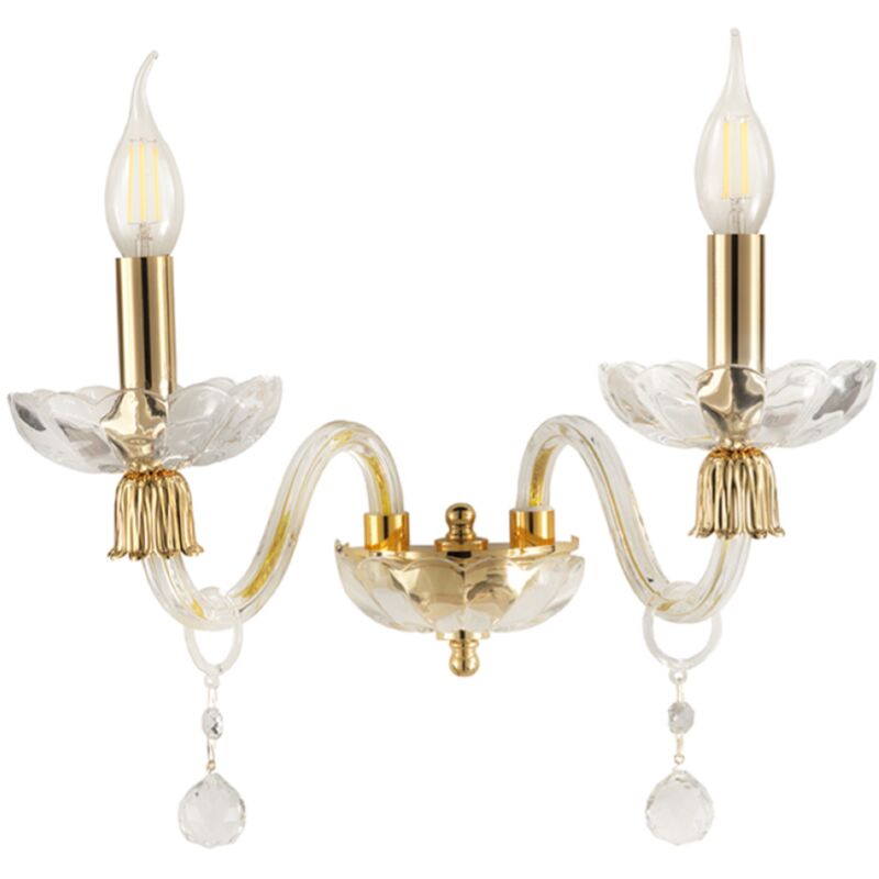 Lampada da parete ROXANNE realizzata in vetro soffiato lavorato a mano con particolari in metallo finitura oro. Un elemento dalle linee classiche e raffinate, ideale per illuminare e al tempo stesso arredare con particolare eleganza salotti e soggiorni in perfetto stile classico-contemporaneo. CARATTERISTICHE Colore: Oro Materiale: Metallo, vetro Tipologia: Lampada da parete Modello: 2 luci Altezza: 22 cm Larghezza: 30 cm Profondita': 20 cm Dimmerabile: No Illuminazione: 2 x E14 ( L'attacco E14 permette di installare lampadine a LED, fluorescenti o alogene non incluse ) Input: 220-230V