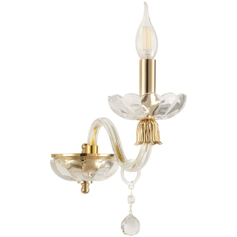 Lampada da parete ROXANNE realizzata in vetro soffiato lavorato a mano con particolari in metallo finitura oro. Un elemento dalle linee classiche e raffinate, ideale per illuminare e al tempo stesso arredare con particolare eleganza salotti e soggiorni in perfetto stile classico-contemporaneo. CARATTERISTICHE Colore: Oro Materiale: Metallo, vetro Tipologia: Lampada da parete Modello: 1 luce Altezza: 22 cm Larghezza: 12 cm Profondita': 28 cm Dimmerabile: No Illuminazione: 1 x E14 ( L'attacco E14 permette di installare lampadine a LED, fluorescenti o alogene non incluse ) Input: 220-230V