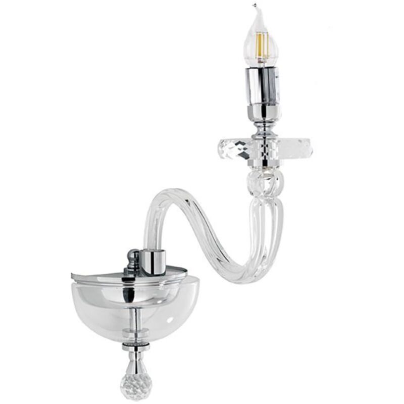 Lampada da parete BACH realizzata in vetro trasparente lavorato a mano con dettagli in metallo. Questa lampada moderna puo' adattarsi in modo unico e originale in ogni ambiente di casa per esempio nel soggiorno, salone o camera da letto. CARATTERISTICHE Colore: Cromo Materiale: Vetro, metallo Tipologia: Applique Modello: 1 luce Altezza: 36 cm Larghezza: 16 cm Sporgenza: 30 cm Dimmerabile: NO Illuminazione: 1 x E14 (L'attacco E14 permette di installare lampadine a LED, fluorescenti o alogene non incluse). Input: 220-230V
