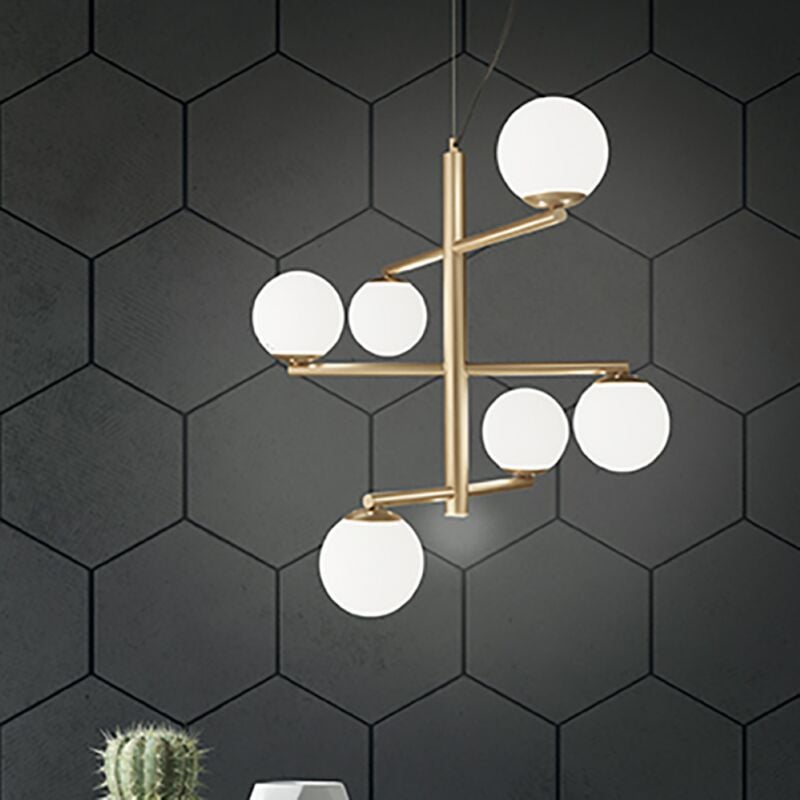Sospensione GIZAH caratterizzata da una forma che ricorda un albero, e' composta da struttura cilindrica centrale in metallo verniciato bianco da cui si diramano 6 aste con 6 diffusori a palla in vetro soffiato bianco. Cavetto regolabile in lunghezza. Un lampadario dallo stile industriale ma al contempo innovativo, perfetto per arredare e illuminare con originalita' un soggiorno, una cucina ma anche banconi di locali pubblici. . Lampada a sospensione GIZAH a 6 luci in metallo con diffusori in vetro soffiato. CARATTERISTICHE Colore: Oro Materiale: Metallo, vetro Tipologia: Lampadario a sospensione Diametro: 76 cm Altezza max: 170 cm Dimmerabile: no Illuminazione: 6 x E14 + 5W LED (L'attacco E14 permette di installare lampadine a LED, fluorescenti o alogene non incluse). Input: 220-230V