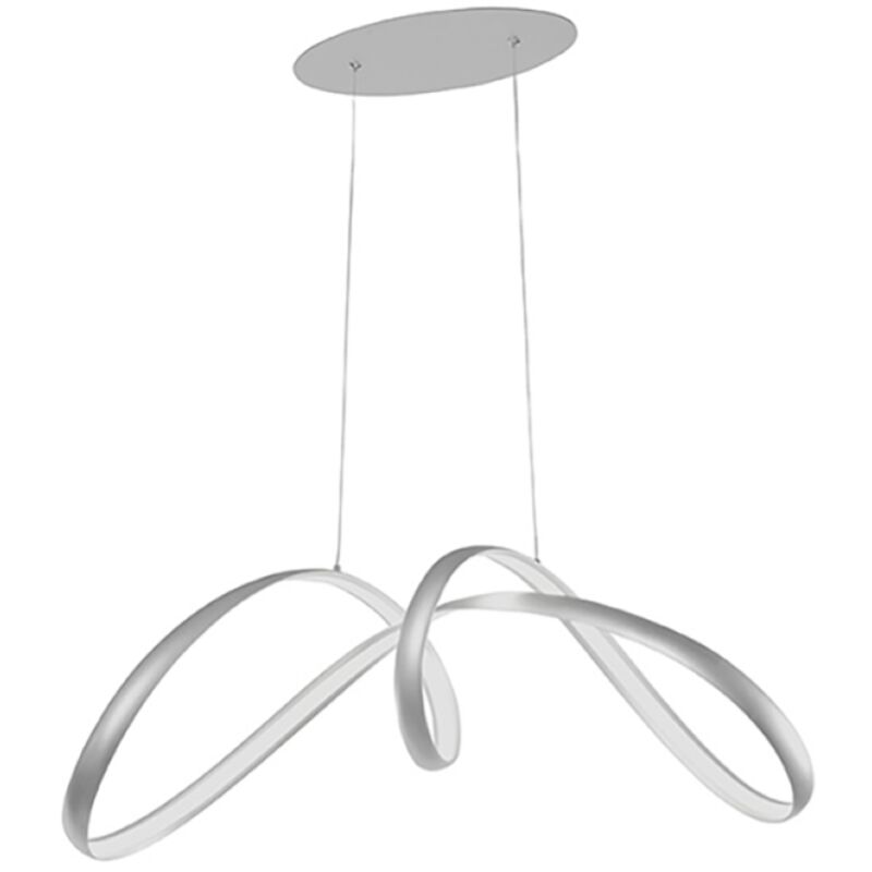 Lampada a sospensione LUMEN a LED in metallo silver La lampada a sospensione LUMEN e' realizzata intermanete in metallo rifinito argento con diffusore in materiale polimerico. Cavi in acciaio regolabili in lunghezza. Un lampadario dal design particolare con delle linee assolutamente originali e intrecciate, concepito per illuminare ed arredare in modo totale e diffuso ogni tipo di ambiente moderno come ad esempio il soggiorno living ma anche stanze di uffici. Modello: PICCOLO Dimensioni: Altezza Massima 120 cm / Larghezza 85 cm / Sporgenza 28 cm Illuminazione: LED INTEGRATO 54W 230V 5390LM 3000K