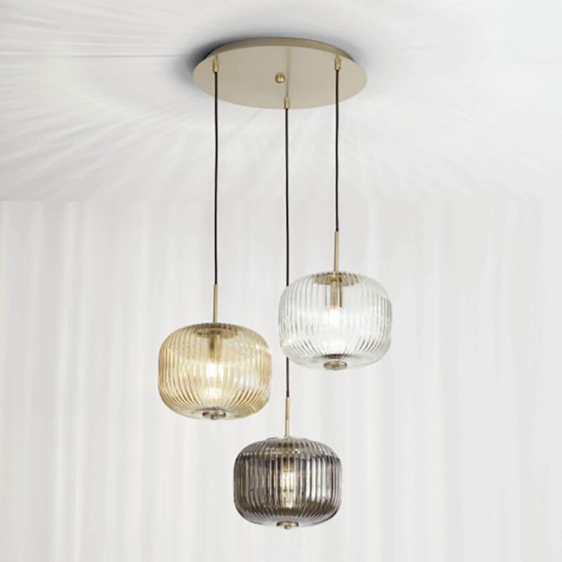Lampadario a sospensione ODETTE composto da una struttura in metallo verniciato dalla quale pendono tramite cavi regolabili in lunghezza 3 diffusori in vetro soffiato millerighi. Un elemento che si caratterizza per il suo design moderno e originale e che si adatta bene ad ambienti arredati in stile retro'. . Lampada a sospensione ODETTE a 3 luci in vetro soffiato millerighi. CARATTERISTICHE Colore: Multicolore Materiale: Metallo, vetro Tipologia: Lampadario a sospensione Larghezza: 43 cm Altezza max: 144 cm Profondita': 43 cm Dimmerabile: no Illuminazione: 3 x E14 (L'attacco E14 permette di installare lampadine a LED, fluorescenti o alogene non incluse). Input: 220-230V