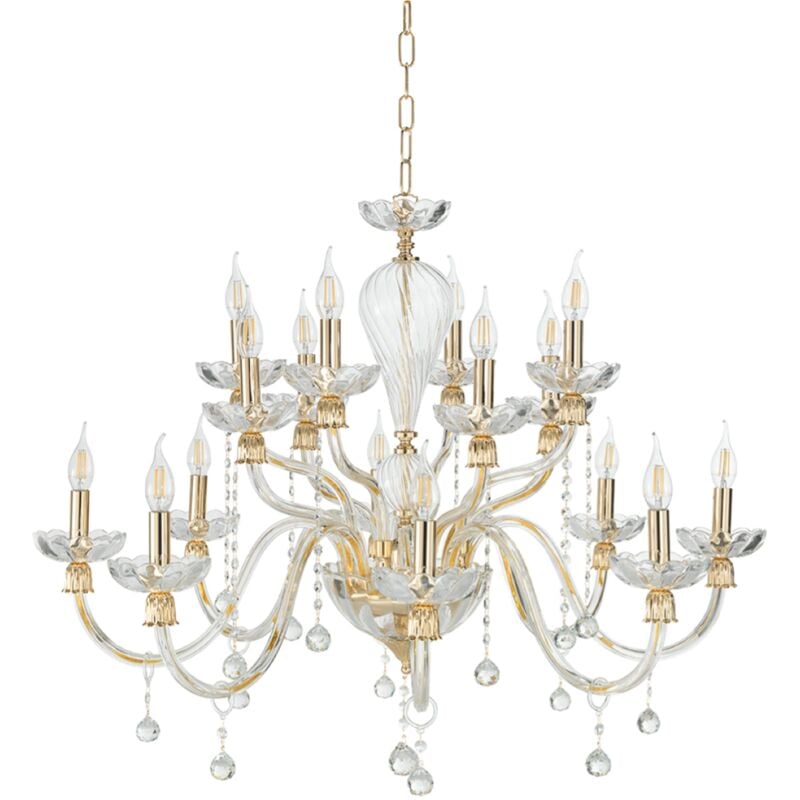 Lampadario a sospensione ROXANNE realizzato in vetro soffiato lavorato a mano con particolari in metallo finitura oro. Un elemento dalle linee classiche e raffinate, ideale per illuminare e al tempo stesso arredare con particolare eleganza salotti e soggiorni in perfetto stile classico-contemporaneo. CARATTERISTICHE Colore: Oro Materiale: Metallo, vetro Tipologia: Lampada a sospensione Modello: 16 luci Altezza max: 138 cm Diametro: 96 cm Dimmerabile: No Illuminazione: 16 x E14 ( L'attacco E14 permette di installare lampadine a LED, fluorescenti o alogene non incluse ) Input: 220-230V