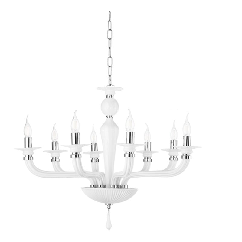Lampadario VILLA realizzato in vetro lavorato a mano con particolari in metallo. Un elemento dalle linee raffinate, ideale per illuminare e al tempo stesso arredare con particolare eleganza salotti e soggiorni contemporanei. Lampada a sospensione VILLA in vetro lavorato a mano. CARATTERISTICHE Colore: Bianco Materiale: Vetro, metallo Tipologia: Lampada a sospesione Modello: 8 luci Altezza max: 135 cm Larghezza: 82 cm Profondita': 82 cm Dimmerabile: NO Illuminazione: 8 x E14 (L'attacco E14 permette di installare lampadine a LED, fluorescenti o alogene non incluse). Input: 220-230V