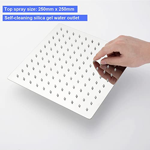 【Facile da Mantenere】 Soffione doccia quadrato 250x250mm in acciaio inossidabile 304, ultra sottile di soli 2 mm di spessore, effetto specchio, anticalcare. Tutti i soffioni hanno ugelli in silicone morbido, che si possono pulire muovendo le dita.