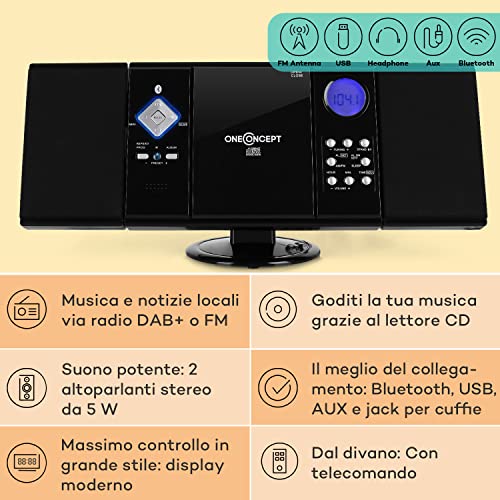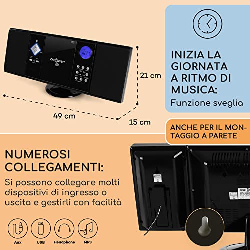 OneConcept Radio Portatile con Lettore CD HiFi, Radio FM Bluetooth e impianto Stereo Casa AUX + 2 Altoparlanti, Display LCD, Telecomando, Sveglia, MP3 e SD, Impianto Hi Fi Stereo Casa Potente 3W