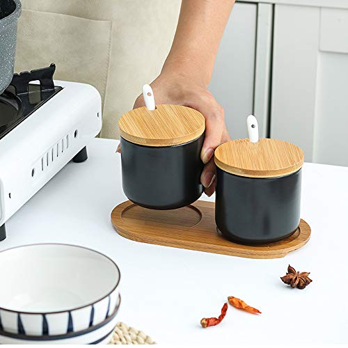 OnePine 260ml Zuccheriera in Ceramica, Contenitore per spezie barattoli spezie Rotonda con Coperchio e Cucchiaio, Design Elegante, per Casa e Cucina (Nero, Set Di 3)