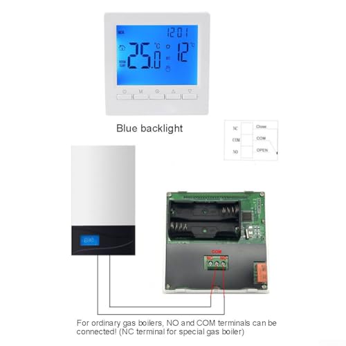 Termostato digitale LCD programmabile: questo termostato dispone di un display digitale a cristalli liquidi ed è alimentato da due batterie da 5 V. È progettato per controllare l'avvio o l'arresto della caldaia, regolando la temperatura ambiente. Quando la temperatura ambiente effettiva è inferiore alla temperatura impostata, il termostato attiva la caldaia per iniziare a funzionare. Al contrario, quando la temperatura ambiente effettiva è superiore alla temperatura impostata, il termostato controlla la caldaia per smettere di funzionare.