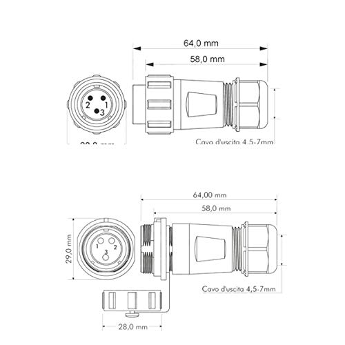 ✅ MONTAGGIO - Contatti a saldare, conduttore max 4mm, diametro cavo min 4,5mm, max 7mm, corrente max 30A 500V