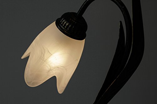 La struttura è in metallo color marrone spennellato oro, mentre il paralume, a forma di calla, è in vetro opaco con decoro alabastro bianco e bordi smerlati