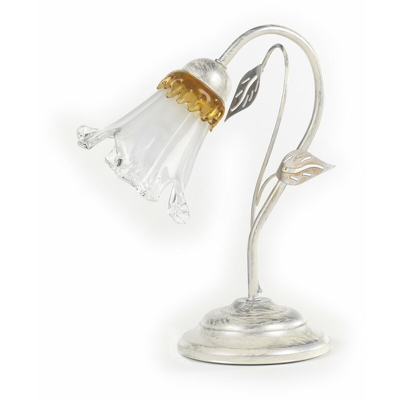 Dimensioni: larghezza 25 cm - altezza 30 cm Tipo di attacco: 1 x E14 (lampadina non inclusa) Struttura in metallo bianco lavorato in Italia e spennellato a mano in argento con sfumature dorate, paralumi in vetro a forma di calla Decorazione con foglie tagliate a laser Stile classico, elegante e raffinato, ideale per la zona giorno ma anche per la camera da letto