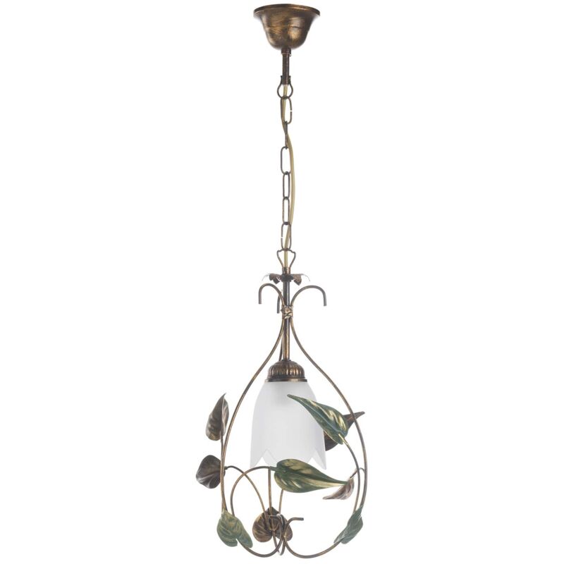 Descrizione Questa piccola calatina in metallo marrone spennellato oro con foglie verdi è ideale per illuminare con eleganza e raffinatezza piccoli spazi, come un angolo cottura o un piccolo ingresso. Il prodotto è in metallo lavorato in Italia e dipinto a mano. Larghezza 20 cm altezza con catena 100 cm. Tipo di attacco: 1 x E14. Contenuto della confezione 1 x calatina Mira 1 x vetro sfumato ambra
