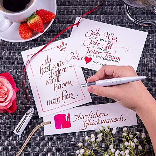 Per principianti e professionisti: un po' di pratica e principianti della calligrafia possono creare dei bei risultati sulla foglia. Anche per i professionisti, la penna stilografica è un'attrazione insolita.