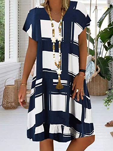 Onsoyours Abito Estivo da Donna Boho in Lino con Scollo V Pois Larghi Pois Manica Corta Casual Allentato Lungo al Ginocchio Lunghezza Una Linea Abito da Spiaggia C Blu 48