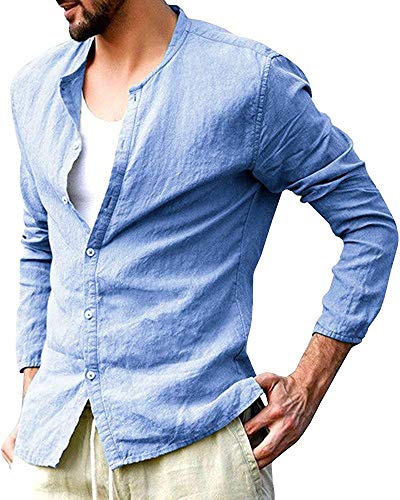 Onsoyours Camicie Lino Uomo Casual Eleganti con Bottoni V Collo Maniche Lunghe T-Shirt Maglietta Tops (X-Small, A Azzurro)