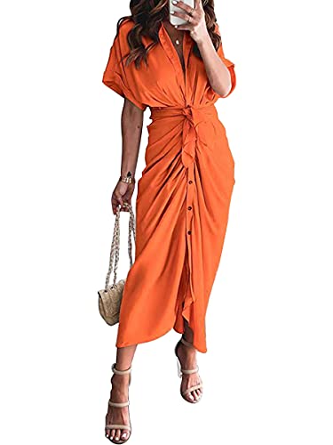 Onsoyours Donna Taglie Forti Estate Vestiti Casual Eleganti Corti Manica Corta V-Collo Cotone E Lino T-Shirt Maxi Vestiti Camicia Abito A Arancione XS