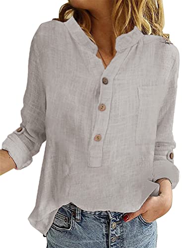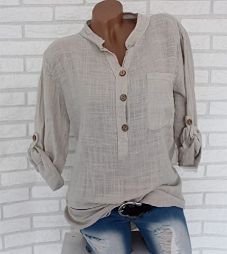 Onsoyours Donne Cotone Lino Camicie Casual Manica Lunga Tinta Unita Pulsante Giù Collo Camicetta da Traspirante Sciolto Camicia con Tasche Albicocca XS