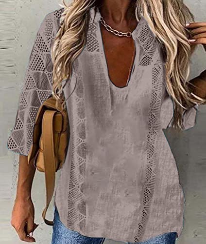 Onsoyours Maglietta da Donna Primavera Estate con Scollo a U Manica a 3/4 Top Vintage con Frange in Pizzo Patchwork Casual Morbide e Comode Magliette di Base A Grigio L