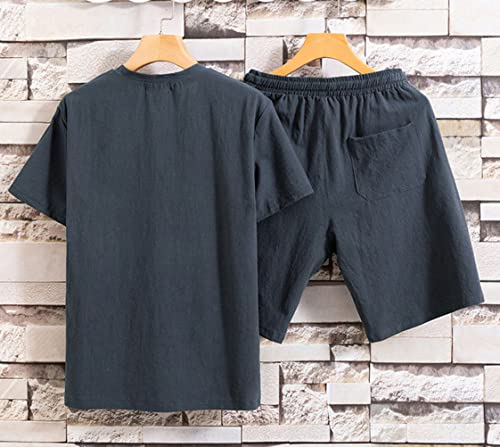 Onsoyours Tute Uomo Estive 2 Pezzi Spiaggia Casual Lino Manica Corta Maglietta + Pantaloncini con Elastico in Vita Set Tute Completa Sportive Elegante A Blu Navy 3XL