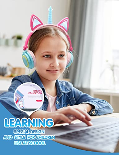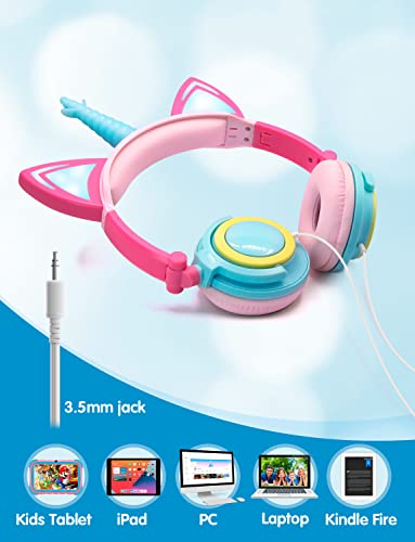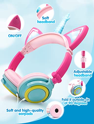 ♫❥Unicorno LED Carino e Design del Padiglione Luminoso - Le cuffie pieghevoli over ear sono state ideate pensando ai tuoi figli. La luce luminosa a LED sulle 2 orecchie da gatto e il corno dell'unicorno si illumina al buio e attira l'attenzione. Al tuo piccino piacerà tantissimo. Gestisci la durata della batteria con il pulsante ON/OFF.