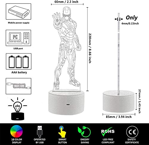 Telecomando e luminosità regolabile - la lampada iron man possono essere in remoto da una distanza di circa 30 piedi. Nostra lampada 3d può regolare la luminosità tramite telecomando. La luminosità regolabile corrispondente alla diversa sensibilità di ogni persona alla luce, in modo da poterli utilizzare come lampada decorativa o una lampada da comodino.