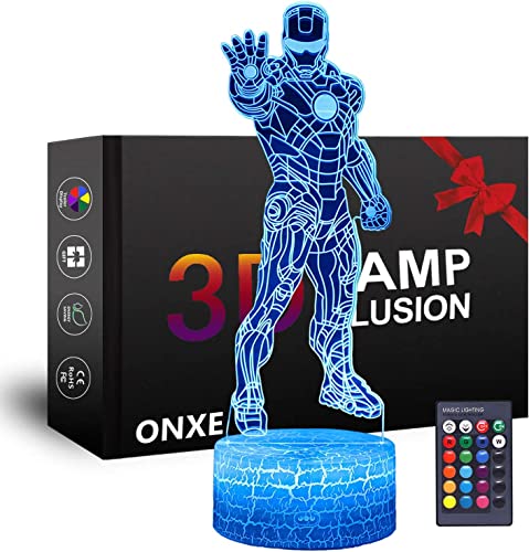 Onxe Led 3D Supereroe Luce Notturna Illusione Ottica Lampada Dimmerabile Usb Touch Control Alimentato Con Base Crepa + Telecomando (Iron Man) 16 Colori