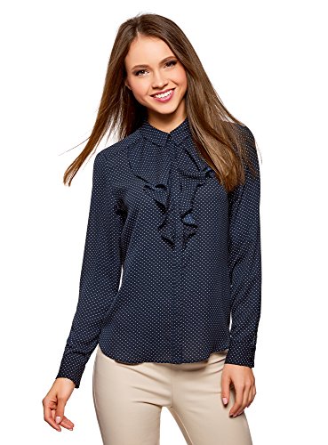 Oodji Collection Donna Camicetta in Tessuto Fluido con Volant, Blu, IT 44 / EU 40 / M