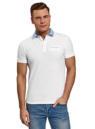 Oodji Ultra Uomo Polo in Cotone con Colletto Rifinito a Contrasto, Bianco, L
