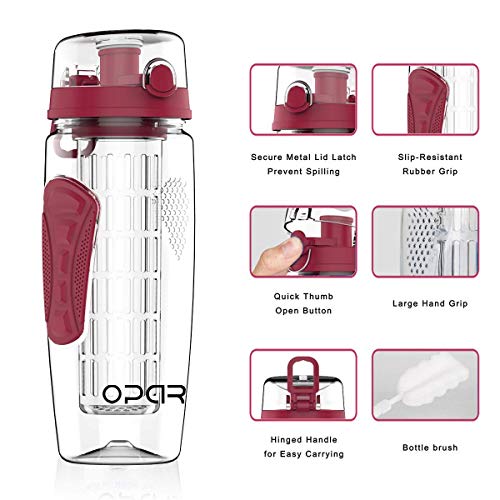 Opard 1L Bottiglie di Bevande a Base di Frutta con idratazione Flip Top e Barra di infusione a Lunghezza Intera e timestamp Senza BPA (Rosso 946ml)