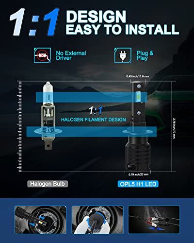 ★【Buone prestazioni di illuminazione】Lampadina LED OPL5 H1, fornita con 40 W 12000 lm per coppia, luce bianca super naturale 6000 K offre una migliore visibilità durante la guida notturna, 200% più luminosa rispetto alle lampadine alogene standard. La tecnologia LED avanzata raggiunge una distanza di uscita più lunga, un campo visivo più ampio, eccellenti prestazioni di illuminazione per incantare la fiducia di guida.