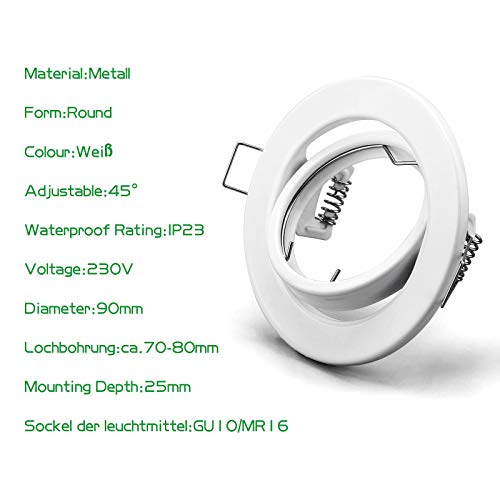 OPPER 10x Porta faretto da incasso rotante incl. portalampada GU10 Per LED e alogene,Dimensioni Ø90×25mm Foro di montaggio Ø68mm,Bianco rotondo,IP23